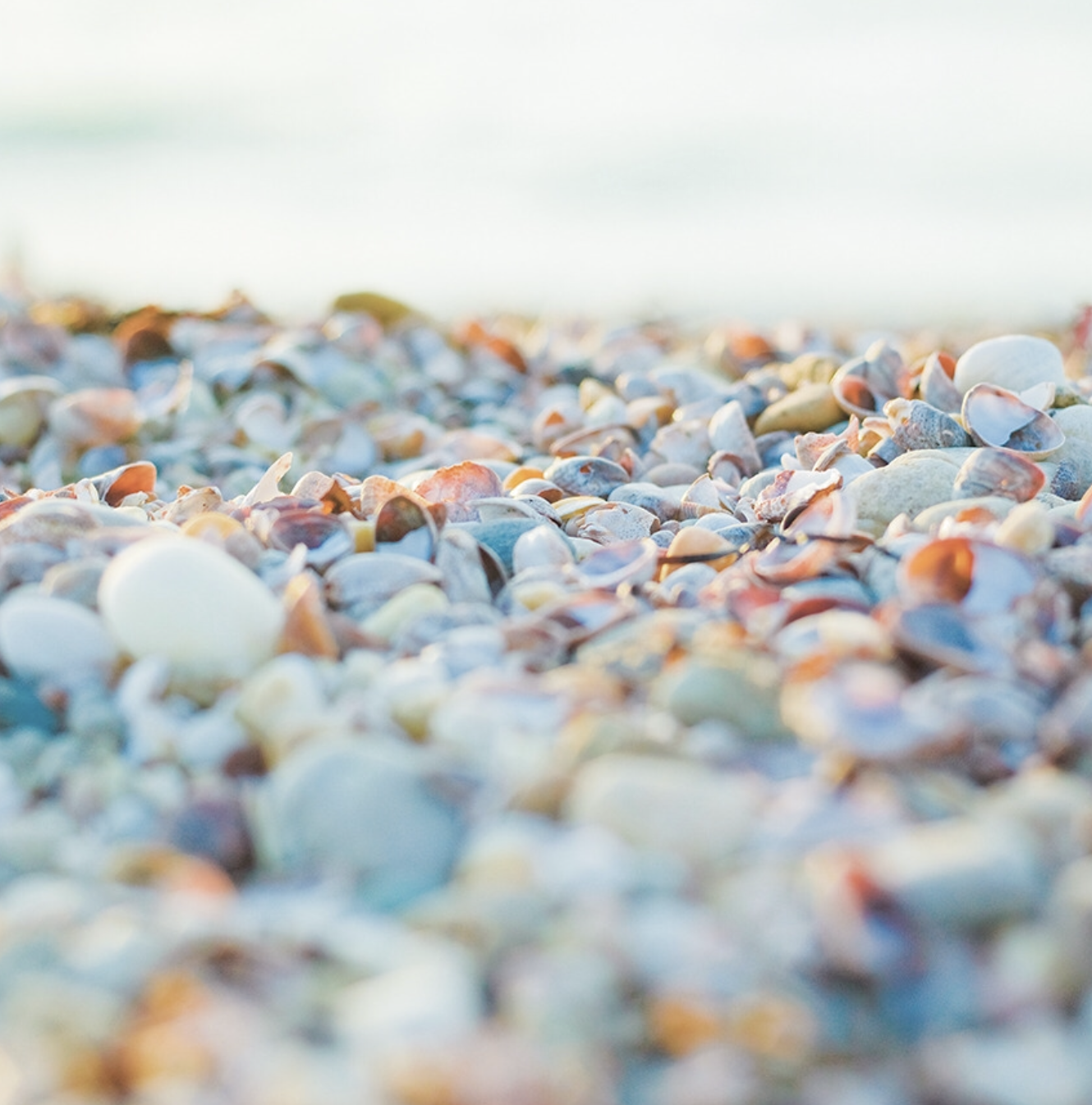 This photograph of seaside pebbles and beach glass in soft peaches, gentle corals, and serene blues beautifully evokes a deep sense of time and place, instilling a calm and peaceful atmosphere while being a statement art piece with its fresh close up perspective. .