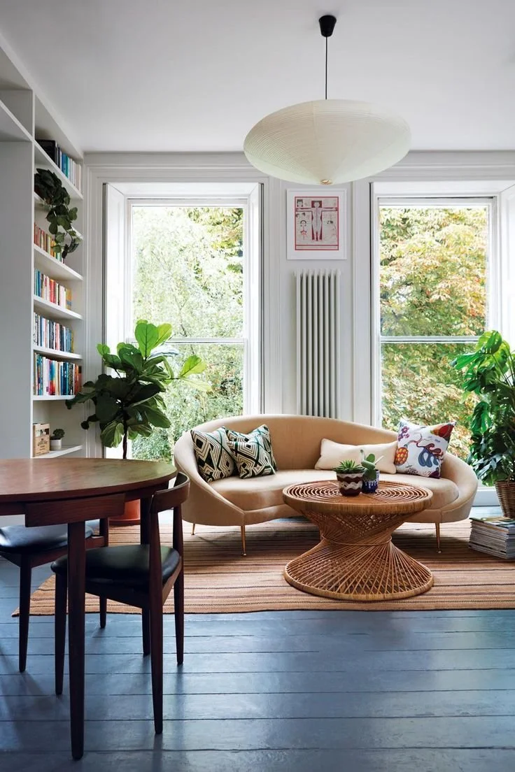 A curved peachy beige neutral sofa has comfortable pillows, natural rug, rattan table, and greenery make this cozy space inviting. The modern classic white light fixture, white builtin bookshelves, and modern art draw the eye up to the high ceiling, while the dark wood floor is grounding. The eating area of natural wood table and chairs creates this natural, multi-purpose contemporary, trending space. Biophlic influence is evident with the lush greenery out the window, infusing the space with natural light, and connection furthered with green plants and a fig tree.