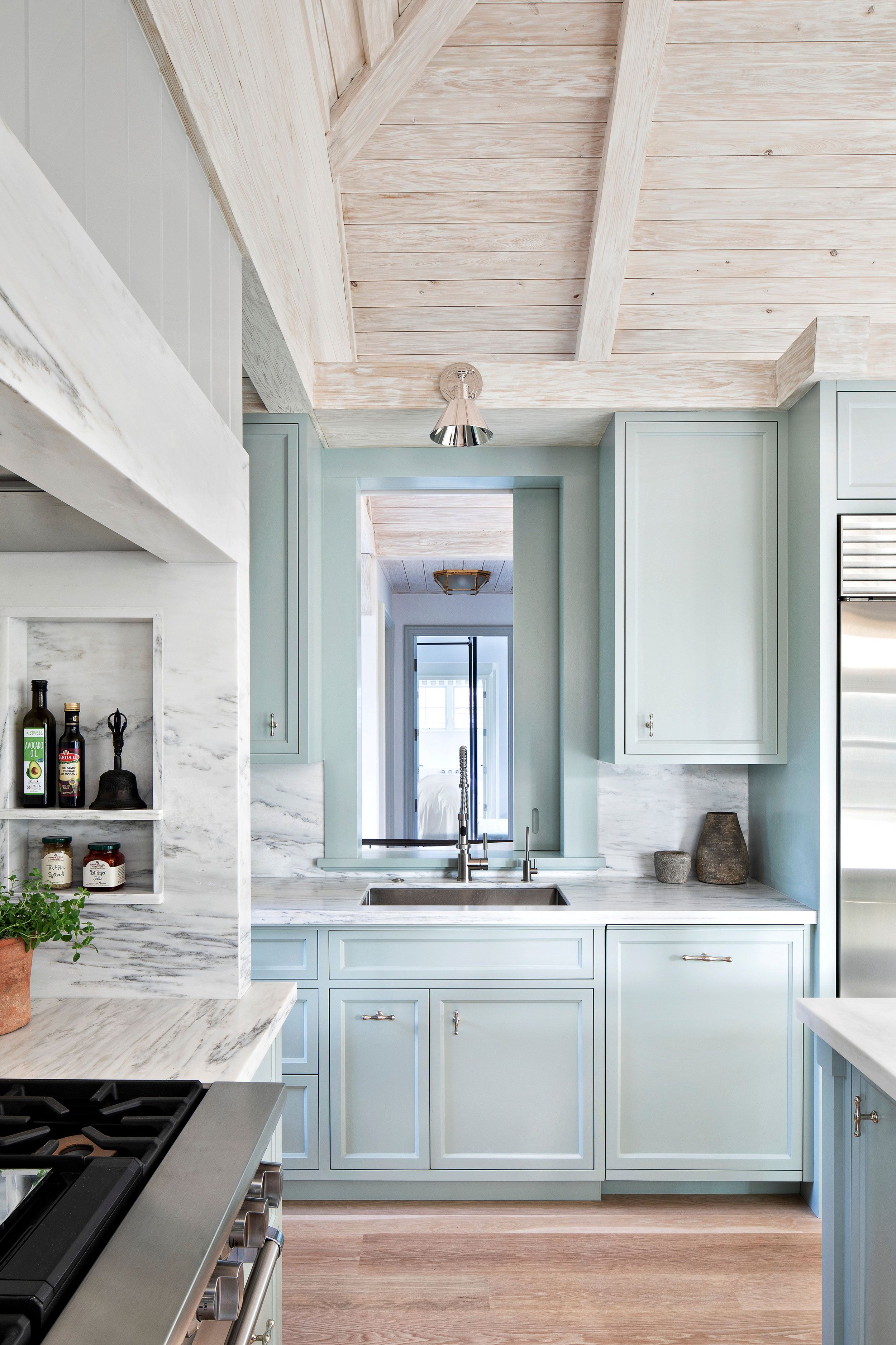 Small coastal Palm Beach kitchen with pale, seafoam blue green cabinetry, light wood finishes, and marble countertops has. a sleek contemporary Hamptons feel, under a vaulted wood ceiling.