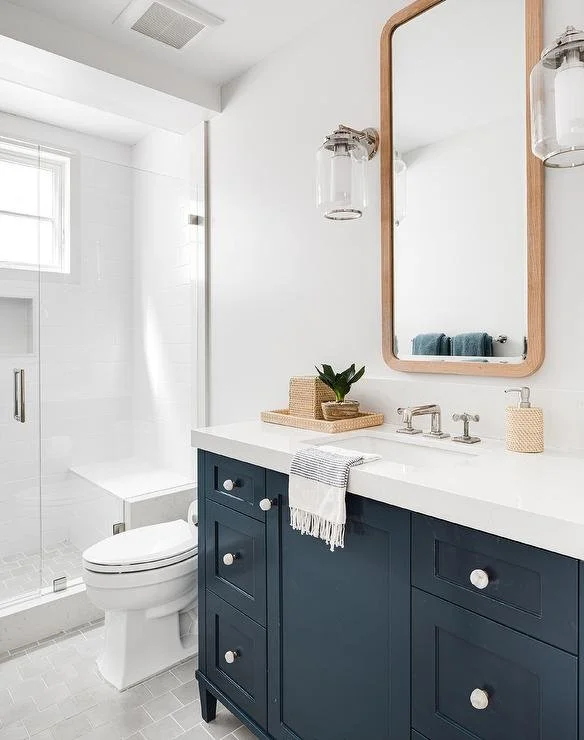 Elegant Palm Beach bathroom with a wellness aesthetic has a dark blue vanity, sleek white countertop, and gray subway tile floor, with wood and rattan accents for a clean lined blue and white coastal style.