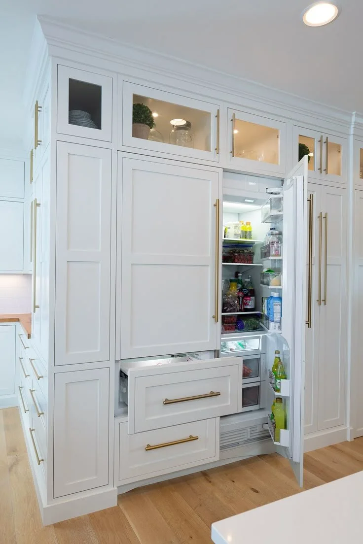 Luxury kitchen with a built-in refrigerator seamlessly integrated into custom white cabinetry with brass handles.