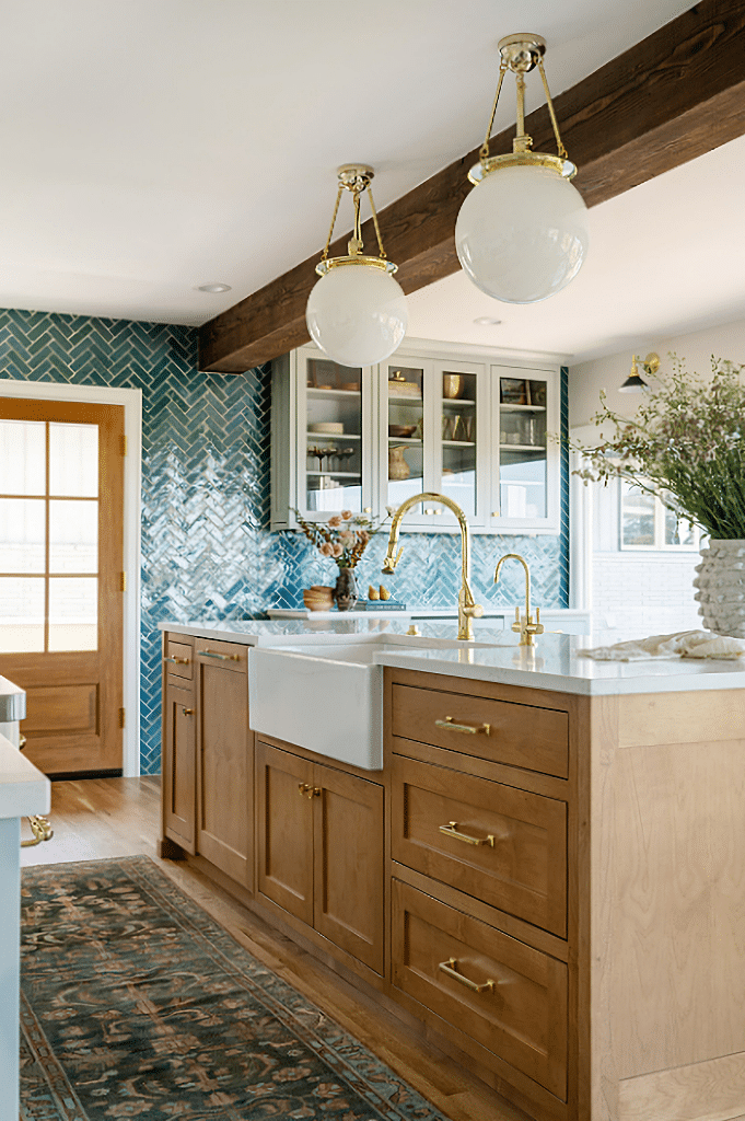 Warm Palm Beach kitchen with two toned and natural cherry wood cabinetry, classic gold fixtures, and a turquoise herringbone tile backsplash add coastal charm. Under cabinet lights and striking pendants add to the functionality and luxury.