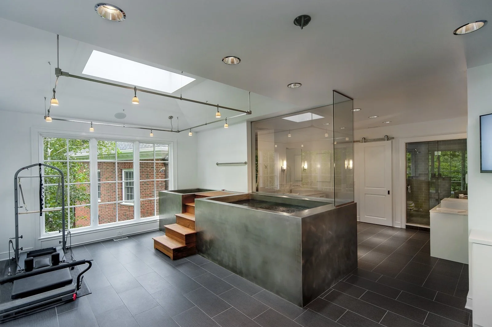 Technology kept discreet—hidden speakers for guided meditation or sound baths, small screens for virtual trainers, but never as the visual focal point.